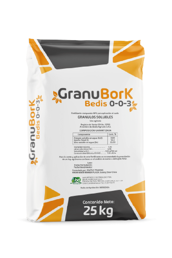 Formulación granulada de alta pureza, rica en potasio (K) y con una elevada concentración de Boro (B), ideal para aplicaciones edáficas que requieren nutrientes esenciales sin contaminantes.
